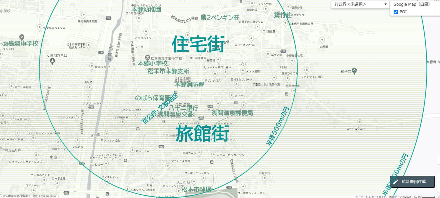 まずはコチラの地図をご覧ください。スマホでご覧の皆さまは拡大してみてみてください。これは浅間温泉の地図ですが、ほぼ中央にある松本市本郷支所から半径500mと半径1000mの円を書いたものです。